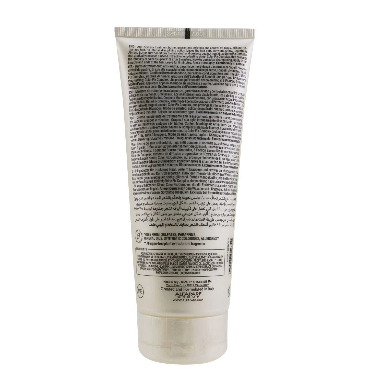 An anti-frizz treatment mask for rebellious hair Features a pleasant butter texture Contains Almond Butter for an anti-frizz & anti-dryness action Formulated with Shine Fix Complex that adds luster to hair Blended with Color Fix Complex for color protection Unveils softer, smoother, nourished & more manageable hair To use: Apply to shampooed hair, gently massage & rinse thoroughly
